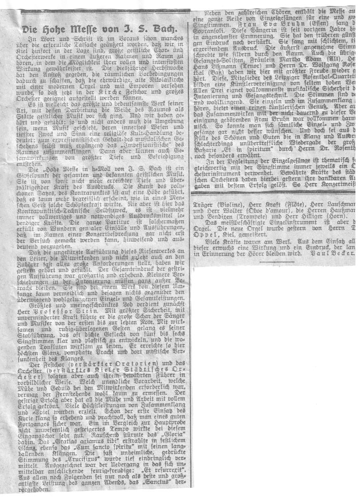 Um alle Großartigkeit und Schönheit des Wunderwerkes auch nur annähernd auszuschöpfen,dazu wird ein einmaliges Hören selbst einem Musiker nicht genügen. Es war deshalb ein guter Gedanke der Leitung des Oratorienvereins, öffentliche Proben zu veranstalten. In drei Chorproben und einer konzertmäßigen Hauptprobe war jedem Gelegenheit gegeben, das Werk kennen zu lernen. Nur wer so vorbereitet am Sonntag in die Nikolaikirche kam, dem erschloß sich die Wunderwelt Bachs in ihrer ganzen Tiefe.