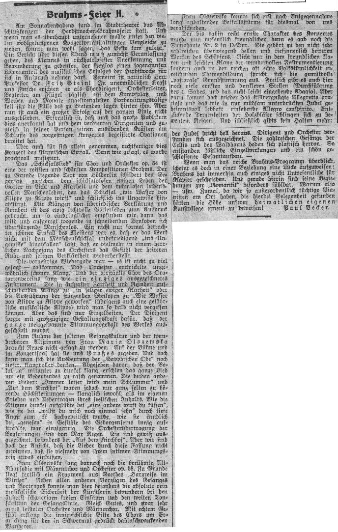 Maria Olszewska sang das Altsolo und drei Brahms-Lieder. Die breit fließende Tiefe, die schwebende Höhe beherrscht die Stimme mit gleicher technischer Sicherheit. Max Reger hat die Lieder zum Klavier „Sapphische Ode“, „Immer leiser wird mein Schlummer“ und „Auf dem Kirchhof“ instrumentiert und damit keinen glücklichen Griff getan. Ehrerbietung vor Reger, dem Meister — aber Brahms möge er lassen, wie er ist. Die Eingangsfigur zum Liede „Der Tag ging regenschwer“ z. B. ist so unmittelbar aus dem Klavier heraus gedacht, daß sie auf das Orchester nicht übertragen werden kann. Was beim Klavier in diesem Falle dramatischer Ausdruck ist, wird im Orchestersatz zu einem Schüttelklang aus dem losen Handgelenk der Geiger. Anderes klang wieder schön, aber dennoch: statt der Mischung Brahms-Reger haben wir lieber den klaren Brahmsquell. Hat doch jeder Meister seines Schaffens Schönheit und Größe genug.