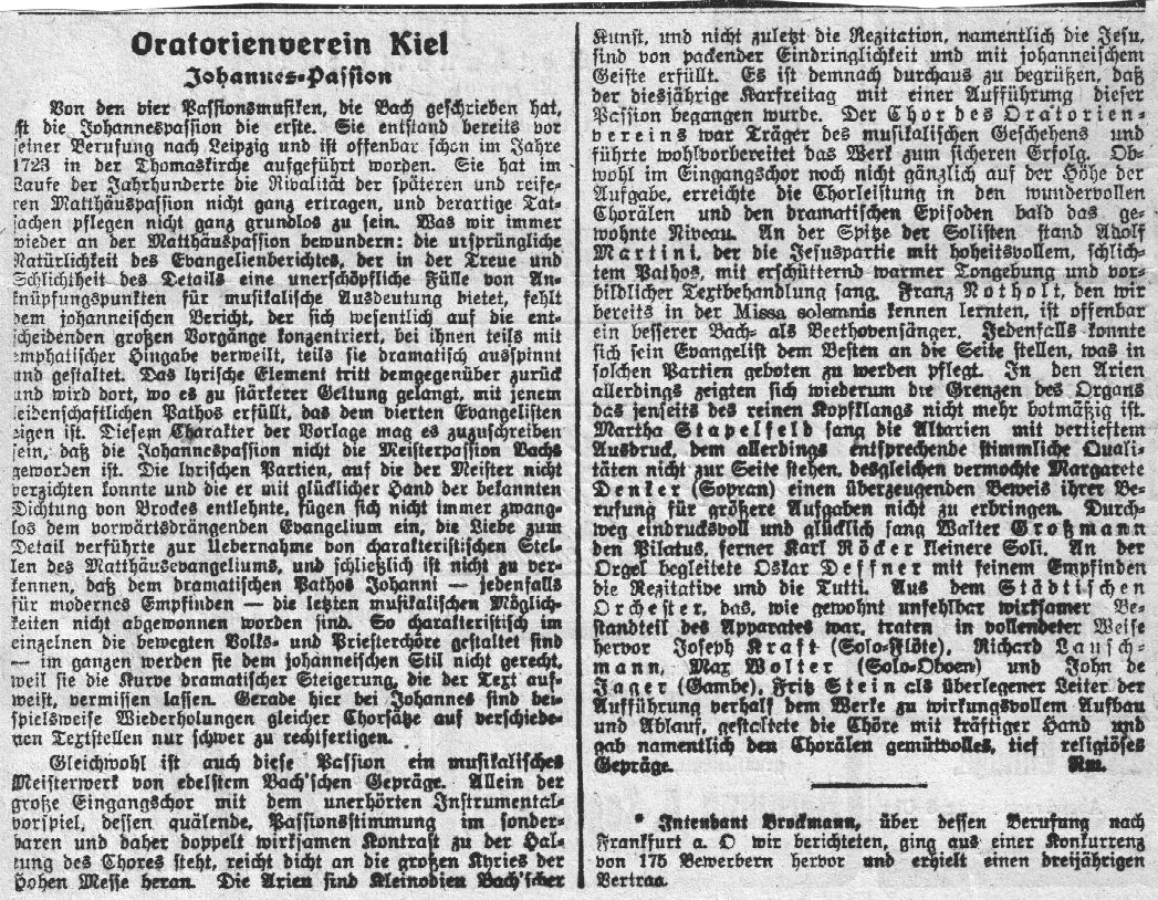 Auf den fest gefügten Quadern des Oratorienchores und des „Städtischen Orchesters“ baute sich die Aufführung auf, für die Herr Professor Stein sich als der geistig bewegte, von konstruktiver Erkenntnis und klarem Gefühl getragene Baumeister erwies. Die Choräle sang der Chor stimmungsvoll und verschmolz mit dem Orchester zu einer Klangeinheit voll Innigkeit und Schönheit. Die Herren Kraft (Flöte), Lauschmann und Wolter (Oboe) und Konzertmeister de Jager (Sologambe) spielten ihre instrumentalen Soli meisterlich. An der Orgel, der eine umfangreiche Aufgabe zufällt, wirkte Herr Deffner. In fein erfaßter Einfühlung begleitete er die Rezitative, deren Registrierung er farbenreich, ohne grell oder unruhig zu werden, gestaltete. Dem Tutti gab er die rechte satte Untermalung.