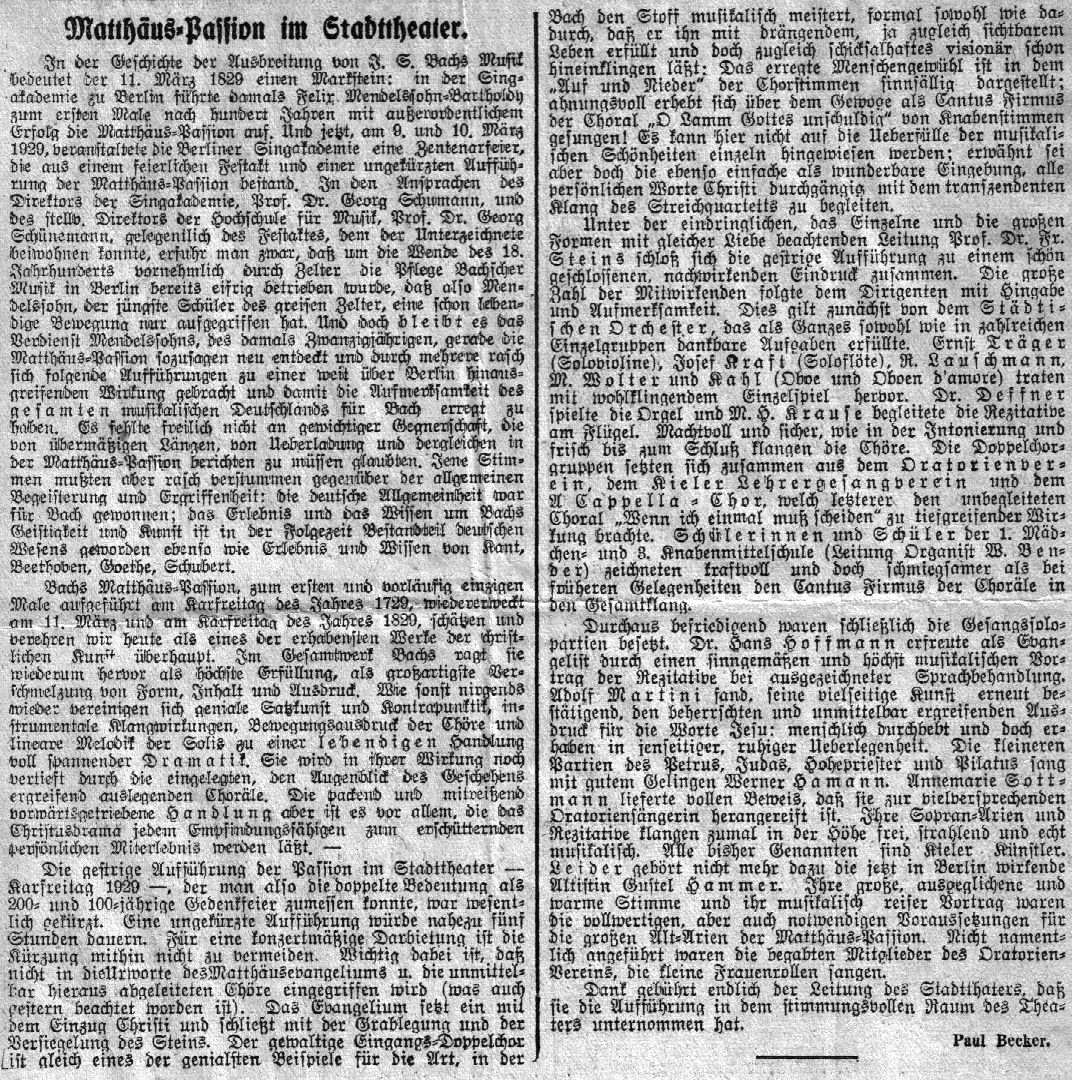 Felix Mendelssohn wurde der Apostel für Bachs Matthäus-Passion. Vor hundert Jahren, am 11. März 1829, brachte er das Werk zur neuen Aufführung in der Singakademie in Berlin. Seitdem ist die Welt voll des Ruhmes über dieses Riesenwerk, dessen Erklingen hinfort auch andere Werke Bachs in den Vordergrund rückte. Heute ist Bachs Stellung die eines glanzumstrahlten Herrschers im Reiche der Musik. Die Grenzen dieses klingenden Reiches sind von uns noch nicht erreicht. Denn manches Stück aus Bachs Gesamtwerk wartet, daß die vor zwei Jahrhunderten geschriebene Note klingender Ton für die Gegenwart werde.