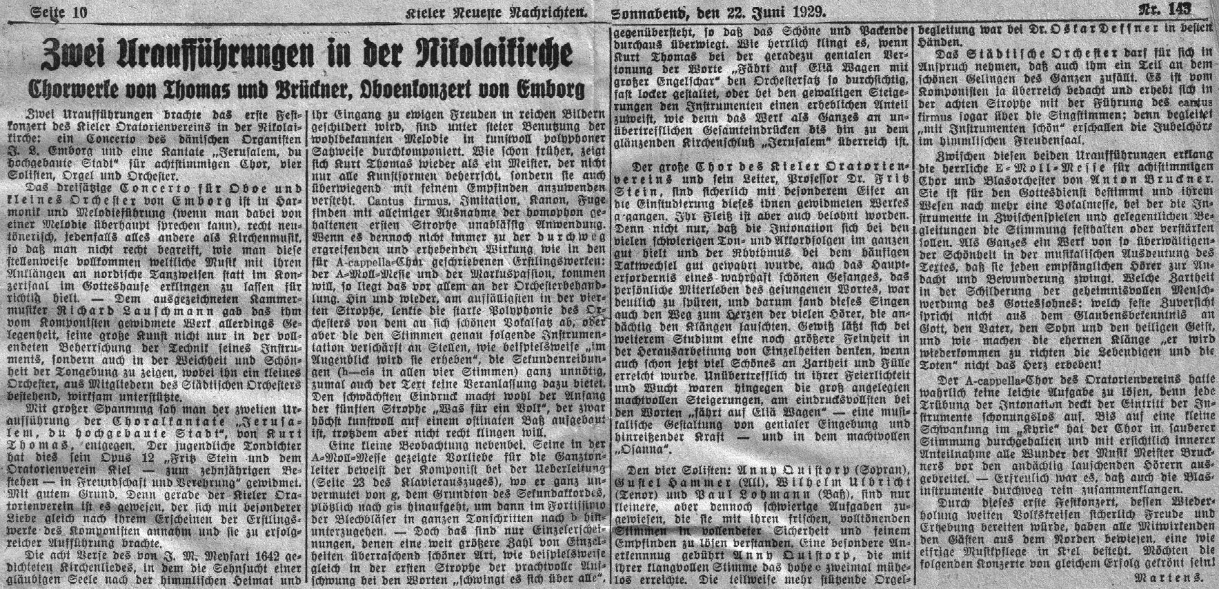 Den erhebenden Abschluß fand das erste Festkonzert mit der Uraufführung der Kantate „Jerusalem, du hochgebaute Stadt“ von Kurt Thomas (Op. 12). Schon der Untertitel dieser Choralkantate verrät, daß Thomas nicht wie bisher mit der größten Beschränkung der äußeren Mittel arbeitet. Er verlangt: achtstimmigen Chor, 4 Soli, Orchester, Orgel. Aber nicht nur hierin liegt die Steigerung gegenüber seinen früheren Werken. Diese ist vielmehr zu suchen und zu finden in der überschäumenden Kraftfülle, die dem Werk entströmt und in der Unbekümmertheit, mit der Thomas aus dem Vollen schöpft. Wahrlich, der ewige Born der Musik sprudelt hier wild-kräftig empor und läßt ein Werk von geschlossenem, wuchtigem Bau und großer Geschlossenheit entstehen. Die Komposition richtet sich nach den Versen und der lapidaren Melodie des ehrwürdigen Chorals von Joh. Mayfart und stellt eine ekstatische Lobpreisung des himmlischen Jerusalems dar. „Mit Jubelklang, mit Instrumenten schön, auf Chören ohne Zahl“ wird die Wonne der erlösten Seele gepriesen. Welche Gläubigkeit! Von dem Reichtum der phantasievollen, mit erstaunlichem Können gearbeiteten Partitur kann an dieser Stelle nur ein wenig zureichendes Bild gegeben werden. Ganz aus der Melodie des Chorals herausgewachsen ist die Musik gleichsam eine Interpretation des Textes. Bald klingen in den einzelnen Stimmen des Chores, bald im Orchester die Töne des Chorals an, große Steigerungen, charaktervolle (so bei dem Osanna im 7. Vers) sekundenlang die Wonnen eines strahlenden C-Dur auskosten läßt. Dazu (zum Festhalten an der Tonalität) gehört heute Mut. — Leere Effekte sind vermieden. Trotz Trommeln, Triangel, Becken, trotz der kirchlichen Trompeten und Posaunen, die stark hervortreten, bleiben Innerlichkeit und ernste Haltung des Werks gewahrt. Und so kommt es, daß nach der erhabenen Schlußkadenz fff die Hörer ergriffen und innerlich beseligt noch lange auf ihren Platzen verharren. Es hat sich gelohnt, dabei gewesen zu sein! Prof. Stein, der das Werk in einem einzigen langen Atem aufbaute, verfügte über einen seltenen Apparat: Das prachtvolle Orchester, den stark beanspruchten Chor (Oratorienverein und Lehrergesangverein), diszipliniert, durchgehalten auch bei schwierigsten Stellen! Von den Solisten müssen diesmal die Damen mit besonderem Recht zuerst genannt werden. Anny Quistorp-Leipzig und Gusta Hammer-Berlin sangen ihre Partien mit empfindungsreichem, innerviertem Ausdruck. Die Herrenstimmen, obwohl so tüchtige Sänger wie Wilhelm Ulbricht und Paul Lohmann-Leipzig bestens tätig waren, traten etwas zurück. der bewährte Oskar Deffner an der Orgel! — Es war ein Aufführung, die lange im Gedächtnis haften bleiben wird. Kurt Thomas hat die Kantate „Fritz Stein und dem Oratorienverein Kiel zum zehnjährigen bestehen in Freundschaft und Verehrung gewidmet.“ Bravo!Mß.