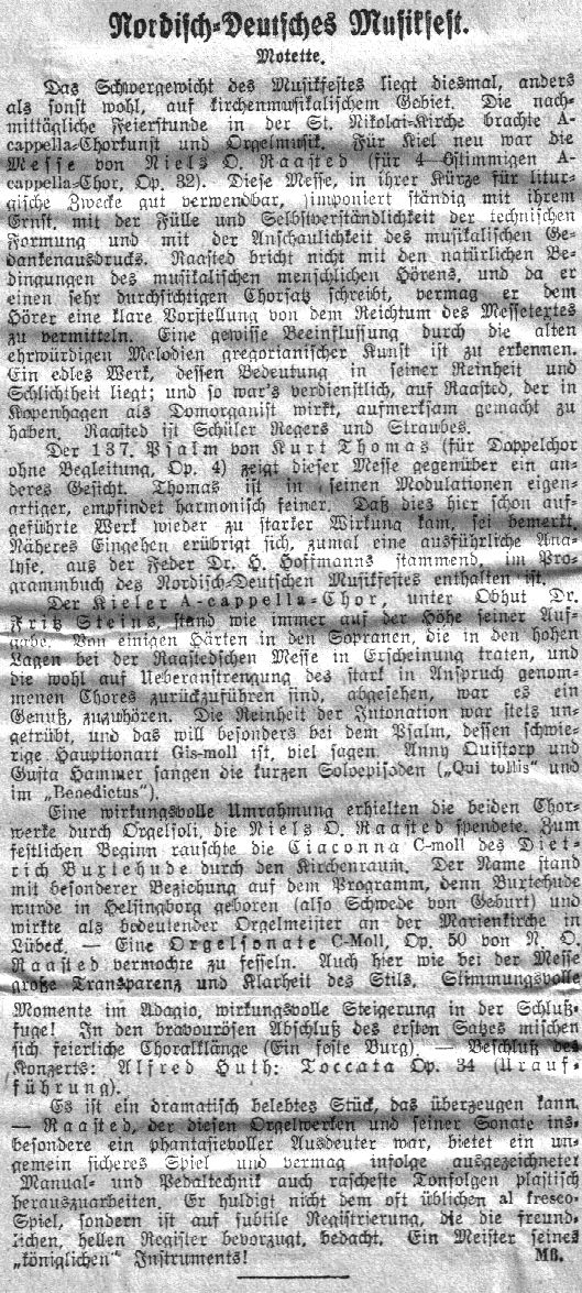 Mit der Musik, die Niels O. Raastedt (Dänemark) schreibt, betritt man das Reich eines besinnlichen Musikers. Sein Sinnen verliert sich nicht in Spekulation. davor bewahrt ihn die innere Nötigung, die Kraft des inneren Schauens, das Intuitive in seinem Schaffen. Es kam seine „Messe für 4-6stimmigen A-cappella-Chor“, op. 32 zur Aufführung, die das Grundwesen Raastedscher Musik offenbarte.