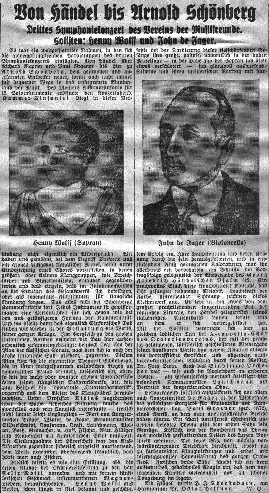 Als Gesangs-Solistin wurde Henny Wolff, Sopran aus Berlin, bei ihrem Erscheinen auf dem Podium freudig begrüßt. Sie war für die erkrankte Mia Peltenburg eingetreten, auch für das vorgesehen gewesene Programm: R. Wagner; Wesendonk-Lieder und HändelPsalm 112. Henny Wolff hat sich in Kiel eine überzeugte und treue Gemeinde geschaffen durch ihre hervorragenden Kunstleistungen bei früheren Gelegenheiten. Sie war es auch gerade, die bei dem Händel-Fest im vorigen Jahr dem Psalm 112 zu einem wirklich sieghaften Erfolg verholfen hatte. Man war also berechtigt, auch gestern wieder Großes zu erwarten. Und in der Tat: für die leidenschaftlichen, stimmungstiefen Liedgedichte Wagners, bereits entstanden aus dem Glühen der Tristansehnsucht und -Qual, wurde Henny Wolff zur berufensten Interpretin. Ihr Vortrag ergriff nicht nur durch das klanglich große und ruhevolle Strömen der Stimme, sondern mehr noch durch die seelische Vertiefung des Ausdrucks, wobei auf dessen Verwandlungsfähigkeit vom Visionären der „Träume“ bis zum Lodern der „Schmerzen“ besoders hingewiesen sei.