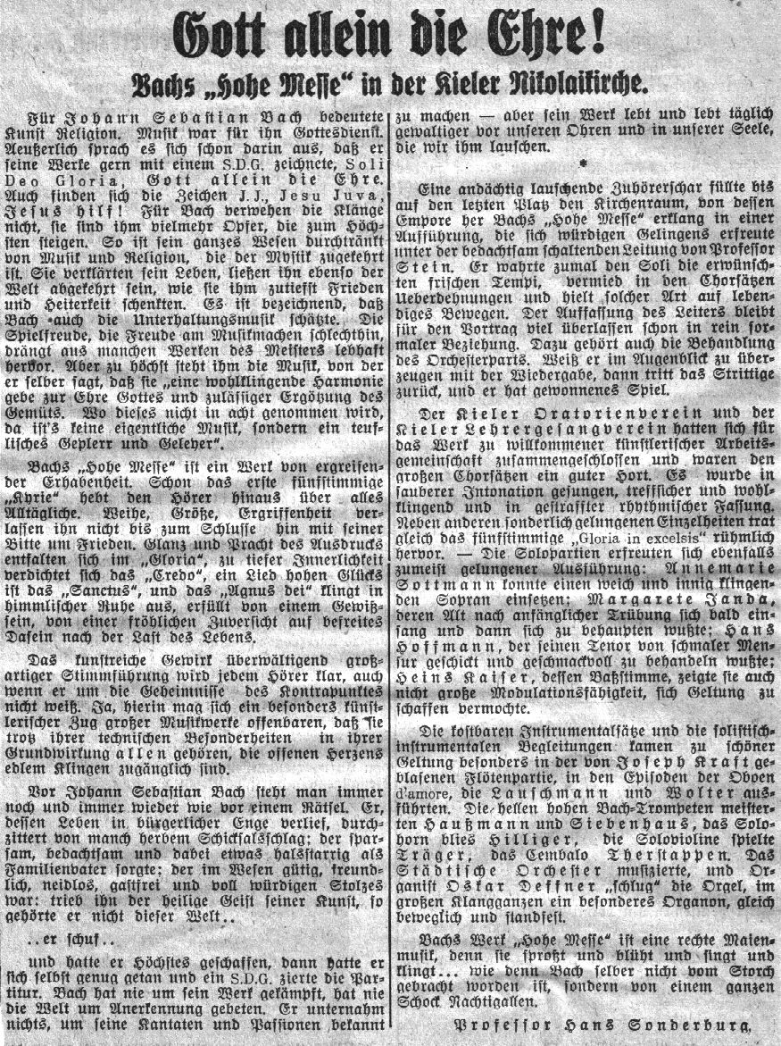 Die Aufführung war festlich und feierlich. Sie zeichnete sich ebenso sehr durch Pracht und Fülle, wie durch ergreifende Innerlichkeit des Vortrages aus. Prof. Stein hat für derlei Dinge die besondere Ader und weiß vor allem seine Begeisterung auf die Mitwirkenden zu übertragen. Der Oratorienverein gab wiedermal einen Beweis seiner hohen Leistungsfähigkeit. Wohltätig beeinflußt wurde der Chorklang durch die Mitwirkung des Lehrergesangvereins, der das unentbehrliche Fundament solider Männerstimmen gab. Ein Ehrentag für diesen Verein, der die Aufführung als sein III. Abonnementskonzert ausgeben durfte. — Erlesene, mit dem Bach-Stil vertraute Solisten! Allen voran ist zu nennen Margarete Janda, die ihre klangvolle Altstimme mit fraulicher Weichheit handhabte. Annemarie Sottmann (Sopran) weiß die glänzende Ausweitung ihrer Stimme nach der Höhe wirkungsvoll auszunutzen und erfreut durch Ebenmaß der Tonbehandlung. Dr. Hans Hoffmann singt seine Partie mit Passion. Tiefe Beseelung des Vortrages zeichnet den Gesang Heins Kaisers (Baß) aus. Dazu unser in hoher Form spielendes Städt. Orchester. Oskar Deffner und H. J. Therstappen die Helfer an der Orgel und am Cembalo. Solistisch traten noch eine ganze Reihe unserer Kammermusiker hervor, von denen Ernst Trägers Leistung (Violinsolo im „Laudamus te“ und im „Benedictus“) hervorgehoben sei. Nicht zu vergessen des trefflichen W. Hilliger, der das gefürchtete Hornsolo im „Quoniam tu“ schlackenlos blies. — Die Kirche war überfüllt. Die ergriffenen Hörer beugten sich vor dem Ewigen, das ihnen im Werke eines Sehers, der da Macht hat, entgegentrat. Mß.