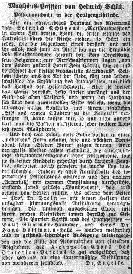 Am gestrigen Sonntagnachmittag veranstaltete der Oratorienverein eine musikalische Andacht in der Heiligengeistkirche und brachte bei dieser Gelegenheit eins der Hauptwerke von Heinrich Schütz in Erinnerung: Die Matthäus-Passion. Man hat sich in neuerer Zeit, im letzten Jahrzehnt etwa, mit der Künstlergestalt Heinrich Schütz‘ mehr und lebhafter auseinandergesetzt als früher. Heinrich-Schütz-Feste wurden veranstaltet, um eine lebendige Vorstellung von dem Gesamtschaffen dieses hochbedeutsamen vorbachschen Tondichters zu vermitteln. Schütz, der „eisgraue Senior“ (er erreichte das schöne Alter von 87 Jahren) und „Vater der deutschen Musikanten“, gilt in der Tat heute „seit Ph. Spittas großzügiger Schütz-Erneuerung endgültig als einer der wenigen Ganzgroßen.“ So liest man’s bei Hans Joachim Moser. Es war somit recht verdienstlich, daß der Oratorienverein den Namen Schütz auf sein Programm setzte.