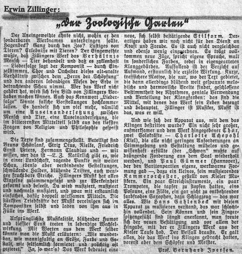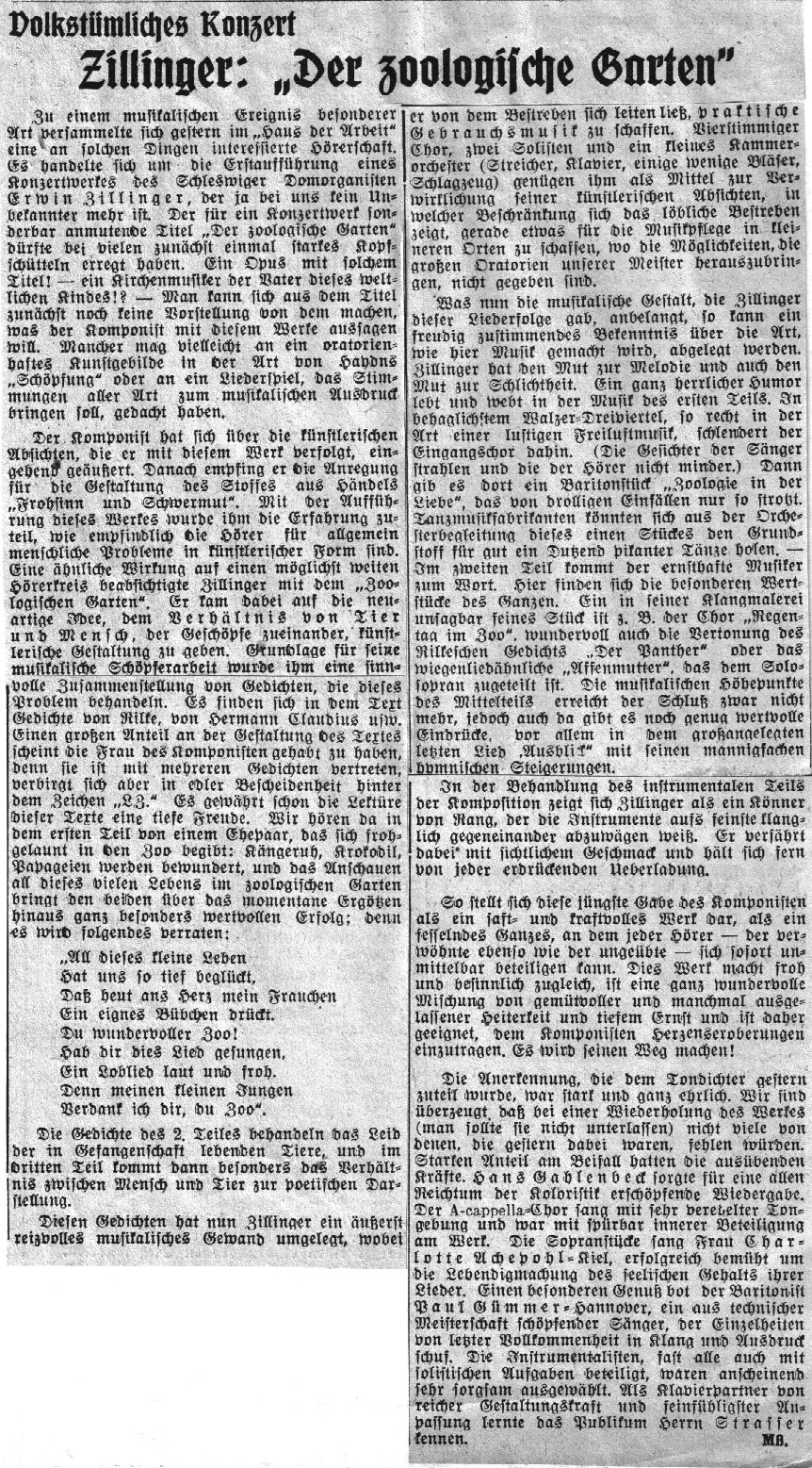 Diese im besten Sinne des Wortes moderne Instrumentierung erhält ihre besondere Note wiederholt durch ein sozusagen konzertierendes Instrument, so durch das Saxophon, das in der melodischen Gestaltung seiner Stimme sehr apart behandelt ist; gelegentlich auch durch die kleine Flöte und die Solovioline (18. Lied). So runden sich zu besonders feinen Stimmungsbildern das 12. Lied „Der Adler“ mit der charakteristischen Trompeteneinleitung, die hier den so bezeichnenden Gegensatz betont zwischen Felsen und Hochwald einerseits und der Enge des Käfigs anderseits; das 13. Lied „Affenmutter“ , wo sich die weiche, wiegenliedartige Melodie äußerst charakteristisch abhebt von den leisen Pizzikato-Bässen auf Tonika und Dominante der Begleitung und das 16. Lied in As-Dur „Schwan“ mit seiner schönen Begleitung von Flöte, Violine und Cello zu den auf- und abwogenden Sechzehntelfiguren im Klavier. Sehr fein wirkt auch der Chorsatz „Regentag im Zoo“ mit dem im Orchester leise markierten Tropfenfall; wie denn überhaupt Zillinger einen klangvollen, übersichtlichen und aufgelockerten, flotten Chorsatz zu schreiben versteht Sehr wirkungsvoll ist der Abschluß des Ganzen, insbesondere von der Stelle ab „Und ein Friede ohnegleichen“, wo sich die Musik in das lichte A-Dur wendet, um nach kurzer Unterbrechung durch das Baritonsolo im Verein von Chor und Solisten zu mächtigem Auf- und Ausklang sich zu erheben. Unter Hans Gahlenbecks temperamentvoller, energischer und umsichtiger Leitung setzte sich das liebenswürdige Werk auch bei uns in Kiel auf der ganzen Linie siegreich durch. Der Städtische a-cappella-Chor bewies erneut seine vortreffliche Schulung und seine musikalisch-künstlerische Schlagfertigkeit. Unter den Solsiten ragte Paul Gümmer aus Hannover hervor. Sein umfangreicher, in allen Lagen schön ausgeglichener, weicher Bariton war ihm ein gefügiges Instrument in der von plastischem Vortrag gestützten Ausdeutung seiner dankbaren Partie. Aber auch Charlotte Achepohl (Kiel) vermochte schätzenswertes gesanglich-musikalisches Können und wohldurchdachten Vortrag an eine erfolgreiche Durchführung ihrer nicht minder wertvollen Aufgabe zu setzen. Am Flügel wirkte an Stelle des im Programm angekündigten Komponisten mit geschickter Anpassung Herr Straßer. Ebenso sei anerkennend des unter Gahlenbecks sicherer Führung mit Hingebung und guter Klangwirkung musizierenden Orchesters (bestehend aus arbeitslosen Kieler Musikern) gedacht. Werk und Aufführung fanden mit Recht sehr bald lebhafteste Zustimmung seitens der offenbar stark interessierten Hörerschaft. Komponist, Dirigent und Solisten konnten am Schlusse wiederholt vor den stürmisch applaudierenden Hörern erscheinen.
