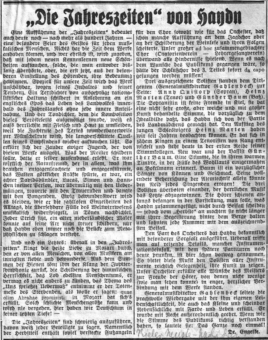 Die Aufführung! — GMD. Hans Gahlenbeck hatte zur Darstellung des Werkes einen stattlichen Chor (Oratorienverein und Kieler Lehrergesangverein) zur Verfügung und hatte es verstanden, beide Chorgruppen in langer Vorarbeit zu einem seinen künstlerischen Absichten ganz gefügigen Instrument zusammenzuschweißen. Der Chor war sozusagen der Hauptsolist; denn man spürte in allen Partien des Chores den Ausdruck inneren Erlebens, so daß es zu einem wirklichen Vermitteln der dem Werke zugrunde liegenden Gemütswerte kam. Wollte man einiges, was an der Chorleistung bestach, herausheben, so müßte man erinnern an die Beweglichkeit des Chores bei den dramatischen Stellen (Jagdchor), an die Herausarbeitung der Wucht in den wie eine Huldigung an Händel anmutenden Chorfugen oder an die Schlagkraft, mit der die geniale Schluß-Koda herausgesungen wurde. Anderseits müßte man auch rühmen, wie die Chöre Weichheit und Fluß der Linien zu bewahren wußten. Die virtuoseste Leistung des Abends war die Gestaltung des Weinchores. Das wurde unter den anfeuernden Händen Gahlenbecks ein echtes, bäuerliches Volksfest, bei dem Lustigkeit und Freude hohe Wellen schlugen.