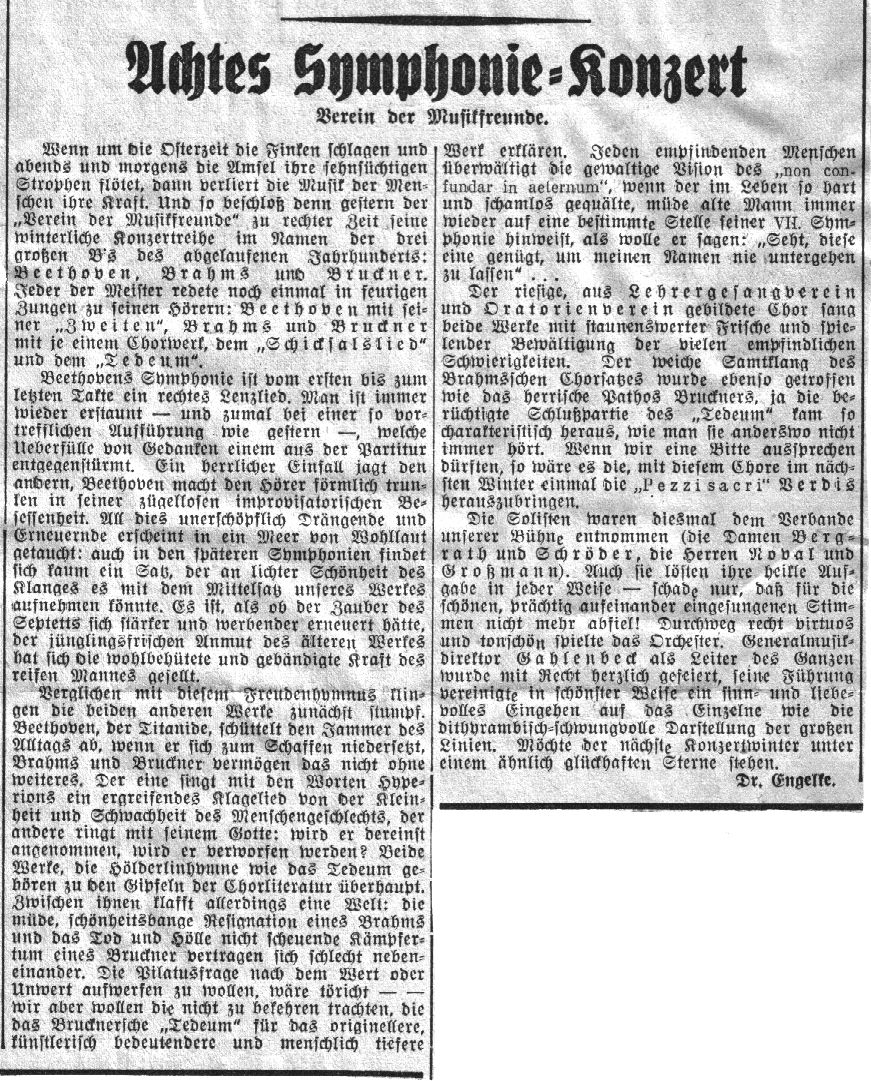 Das gestrige Konzert wurde mit Beethovens Symphonie Nr. II, in D-dur, eingeleitet. Ihre Wiedergabe durch Generalmusikdirektor Gahlenbeck und das prächtig spielende Orchester verriet eine außerordentlich fleißige und sorgsame Vorarbeit. Die über alle Sätze ausgebreitete Klarheit machte es dem Hörer leicht, die zu kraftvollem Leben erweckte Gedankenfülle des Werkes restlos erkennend zu durchdringen. Mit beglückender Ruhe wurde der langsame Satz musiziert, dessen wundervoller Gesang auf weitem, ruhig strömendem Atem des Orchesters in all seiner Herrlichkeit und Empfindungsstärke erblühte. Man dankte dem Dirigenten und seinem Orchester sehr herzlich für die ausgezeichnete Wiedergabe der Symphonie.