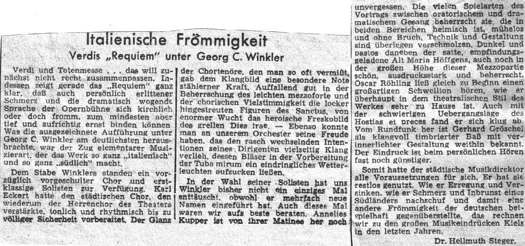 In Deutschland wird man kaum eine Aufführung erleben, die dem wirklichen Charakter des Werkes entspricht. Wir werden uns damit abfinden müssen. Verdis große „musikdramatische Totenklage“ um seinen Freund Manzoni in abgekühlter, protestantischer „Uebersetzung“ zu hören. Das leidenschaftliche, theatralisch gestimmte religiöse Pathos, das Verdis Werk melodiös durchflutet, erscheint deutschen Dirigenten und Hörern als zu opernhaft. Georg C. Winkler, der auch den Bühnen-Verdi sehr substantiell und strukturell musiziert, legt auf dieser Anschauungsbasis auch die Requiem - Aufführung fest. Die dramatische Akzentuierung wurde unter seiner Führung wohl erfüllt, die große, strömende Kantabilität aber sowohl im Orchester als auch bei Solisten und Chor zurückgedrängt. Das Orchester erklang dezent-präzise, jedoch ohne die Süße, die Verdi noch in den Schmerz zu legen versteht. Der Städtische Chor zeigte sich beachtlich der großen Aufgabe gewachsen, die Unterstützung durch den Herrrenchor der Städt. Bühnen erwies sich namentlich bei den Bässen als sehr vorteilhaft. Die Solisten schienen ein wenig vom Temperatursturz des Tages beeiunflußt zu sein. Anneliese Kupper (Sopran) half sich weitgehend mit gesangstechnischen Routine-Mitteln (Abdecken und Anschieben exponierter Töne), so daß sie die Möglichkeiten ihrer Partie nicht voll ausschöpfte. Oskar Röhling (Tenor) schien gelegentlich in den großen Gesangsstil ausbrechen zu wollen, fügte sich aber — vielleicht stimmlich auch etwas gehemmt — in den Oratorienstil, den Gerhard Gröschel (Baß) mit seinem sehr vornehm tembrierten Organ am klarsten vertrat. Auch Marga Höffgen (Alt) besitzt ein kultiviertes, sehr ansprechendes Organ und überzeugendes Stilgefühl, das sie nur durch die Manier des deutschen Oratorienstils — nämlich alle Vokale stark abzudecken — beeinträchtigt.