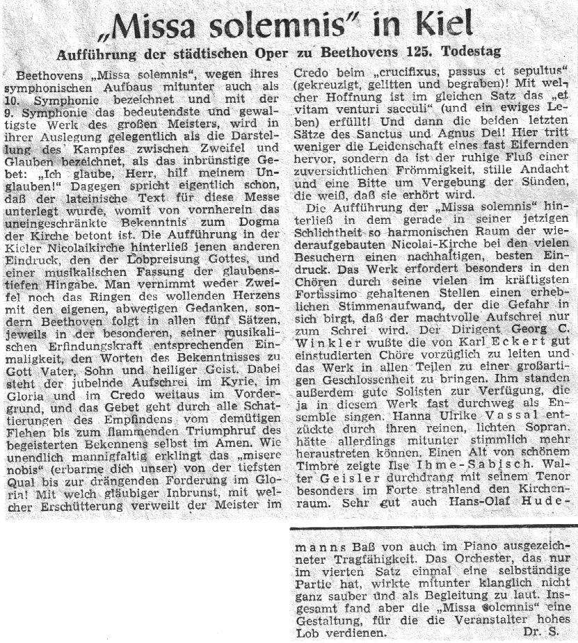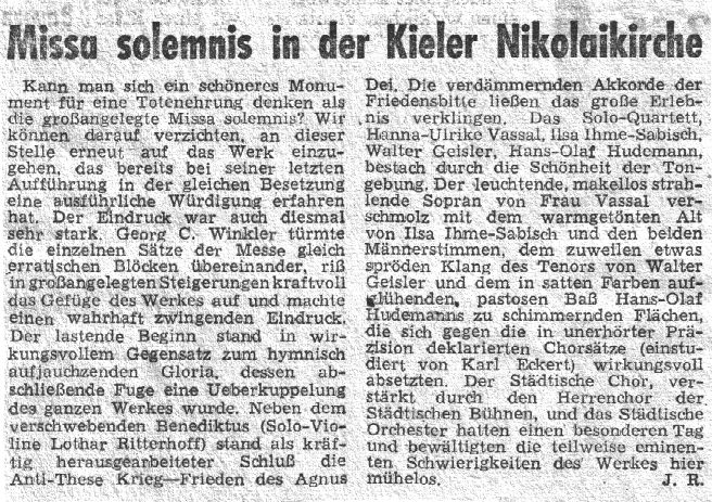 Die Wiederaufführung durch den Städtischen Chor befestigte im Ganzen die guten Eindrücke des vorigen Jahres. Die lange und intensive Probenarbeit (unter der nun schon bewährten Leitung Karl Eckerts), das wirtschaftliche Risiko des eigenen Konzertes, fanden in der bis auf den letzten Platz gefüllten Kirche und in der künstlerischen Leistung schönsten Lohn. Georg C. Winkler stellte die starken Gegensätze des Werkes, an denen es ja wahrlich reich ist, sehr eindrücklich heraus. Er steigert Zeitmaß und Dynamik. Die Missa wird zum Drama. Chor und Orchester folgen ihm dabei unbedingt und zuverlässig. Der Sopran hat es in den hohen Lagen nicht immer leicht, einen so starken Ausdruckswillen mit guter Tongebung zu verbinden. Doch hat sich der Städtische Chor nun schon mehrfach als wertvoller Mittler erwiesen, zumal die Männerstimmen nach Zahl, Können und Ausddruck den Frauenstimmen voll gewachsen sind. Imponierend die Wucht und Geschlossenheit der großen Fugen, ohne Tadel und überlegen die rhythmische Sicherheit etwa der langen synkopierten Stellen, das Piano mehrfach wundervoll verhalten und tragend.