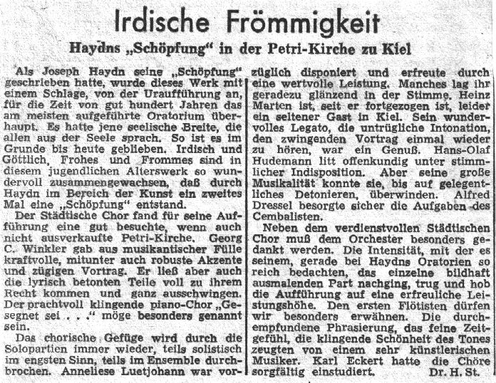 Die Aufführung war — trotz einiger Mängel — ein gelungener Abschluß der Konzertsaison. Der Chor, von Karl Eckert sorgfältig einstudiert, sang diszipliniert und mit gewohnter Präzision, überzog aber zuweilen im forte und hätte bei aller musikalischen Intensität stärker auf genaue Artikulation achten müssen. Sehr differenziert und mit starker Einfühlung in das Wesen des Werkes musizierte das Orchester; am Cembalo mit äußerster Gewissenhaftigkeit: Alfred Dressel.