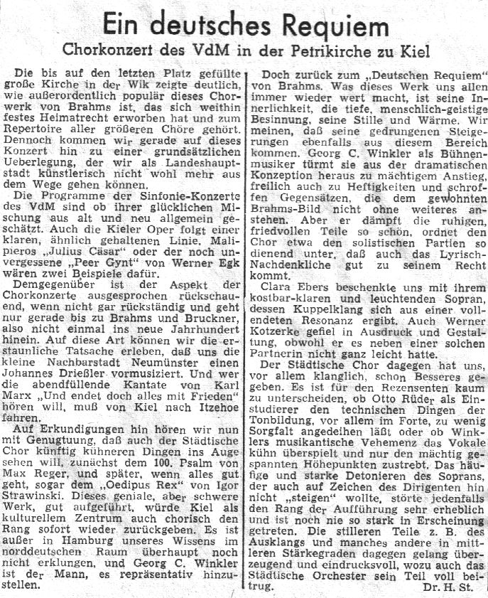 Brahms' Requiem nach von ihm selbst ausgewählten Bibelstellen, das einzige große Gegenstück protestantischen Geistes zu den vielen Vertonungen des lateinischen, katholich-liturgischen Requiemtextes, fand (als drittes Anrechtskonzert des VdM) in der Petruskirche eine sehr eindrucksvolle Interpretation. Georg C. Winkler gab der Wiedergabe ganz das romantische Weltgefühl, aus dem die Komposition entstand; die ganz große Ausdrucksskala des Werkes — von zartester Lyrik bis zu effektvoll-dramatischen Klangwirkungen — wurde vollkommen reflektiert. Unerhört lebendig und ausdrucksstark waren die großartig gebauten Steigerungen und die dynamische Abstufung und Aufgliederung des Ganzen. — Der Städtische Chor (die exakte Einstudierung besorgte Otto Rüder) bewies erneut seine Fähigkeit, mitgestaltend zu wirken; ist das Problem Nr. 1 aller Chöre, die ausreichende Besetzung der Männerstimmen, besonders der Tenöre, auch bei ihm noch nicht gelöst, klingen die hohen Soprane auch zuweilen etwas hart — der Gesamteindruck ist vorzüglich. Ausnehmend schön und tragend übrigens das Piano und Pianissimo — das Forte ist trotz der vielen jungen Stimmen manchmal in Gefahr, spröde zu werden. Das Städtische Orchester musizierte anpassungsfähig mit echter eigener Intensität. — Clara Ebers (Staatsoper Hamburg) sang das Sopran-Solo sehr schlicht, sehr verinnerlicht, sehr edel in Tonführung und Ausdruck. Ihr Stimmklang ist voller, kompakter, ihr Timbre noch wärmer und samtiger geworden; mit ihr fand diese kurze, aber schwierige Partie eine wirklich ideale Besetzung. Werner Kotzerke (Bühnen der Landeshauptstadt) wirkte dagegen blaß; Sein Bariton ist technisch noch nicht voll durchgebildet und zeigt auch im Timbre noch keine persönliche Farbe. Auch seine Fähigkeit zur künstlerischen Gestaltung scheint noch unentwickelt, reicht jedenfalls für diese Partie nicht aus. — Die Petruskirche war bis zum letzten Platz besetzt; das Publikum zeigte sich von der Gesamtleistung stark beeindruckt. S. M.