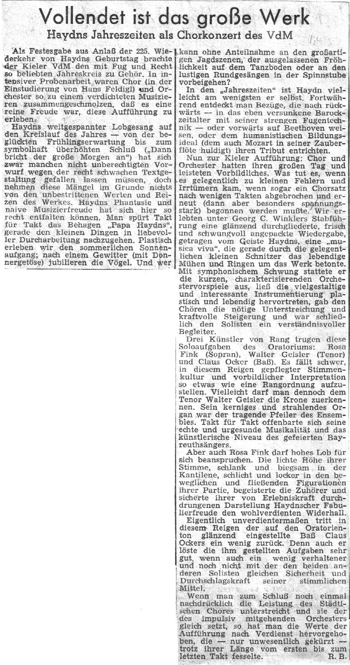 Die ursprünglich rein betrachtende Dichtung Thompsons hat van Swieten scheinbar dramatisiert, indem er sie dialogmäßig aufteilte in mehrere Chöre und drei Solopartien: den Pächter Simon — in der Kieler Aufführung gesungen von Claus Ocker (Baß), seine Tochter Hanne — Rose Fink (Sopran) — und Lukas, einen jungen Bauern — Walter Geisler (Tenor). Die drei Sänger wurden ihrer Aufgabe durchaus gerecht; Rose Fink verfügt über einen schönen, klaren Sopran und weiß technisches Können mit Natürlichkeit des Ausdrucks zu verbinden. Leider ließ sie sich, offenbar unter dem Eindruck des großen Saals, gelegentlich dazu verleiten, etwas zu forcieren, was vereinzelt Schärfen und Unsauberkeiten zur Folge hatte. Walter Geisler sang den Lukas ebenso tonschön wie musikalisch, wenn er auch mehr auf der Bühne zu Hause sein dürfte, im Gegensatz zu Claus Ocker, dessen schönes Organ für einen Baß zwar ungewöhnlich hell timbriert ist, der aber als einziger die stilistischen Anforderungen des Oratoriums erfüllte: undramatische, fast instrumentale Tonführung, verbunden — in diesem Falle — mit ausgezeichneter Deutlichkeit der Aussprache.