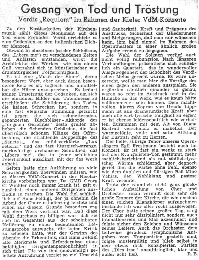 Die Aufführung in der Nicolai-Kirche war sehr eindrucksvoll; man hörte ihr an, daß sie gründlich und intensiv erarbeitet war. Hans Feldigl hatte sie präzis einstudiert und leitete sie mit überlegener Sicherheit, durchdacht und logisch im Aufbau, hervorragend differenziert in der Dynamik. Seine Zeichengebung ist sparsam, genau, eindeutig. Die Sänger behandelte er mit soviel Liebe und „Singverstand“, daß er ihnen gelegentlich sogar um ein weniges nachgab, wo es technischer Begrenzungen wegen wünschenswert (Chor) oder um schönen Klanges willen allzu verführerisch (Solisten) war. So erschienen die schnellen Tempi nicht immer scharf genug akzentuiert, doch es ging da nur um Bruchteile von Graden, die gerade bei diesem Werk nicht ausschlaggebend sind. Die Leistung des jungen Musikers war durchaus bewundernswert. — Der Städtische Chor sang seinen relativ kleinen, aber äußerst schwierigen Part diszipliniert, klangschön, sehr variabel und „beteiligt“ im Ausdruck; die Männersstimmen haben an Gewicht und Leuchtkraft gewonnen, könnten jedoch immer noch Zuwachs vertragen.