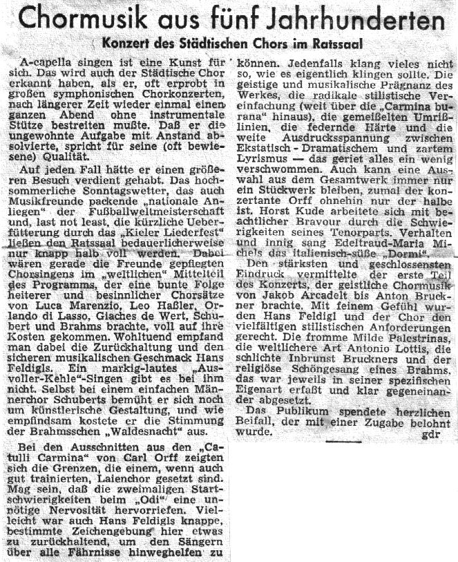 Sommerliche Konzertmüdigkeit, Urlaubsstimmung, ein Ueberangebot an Chormusik in der letzten Zeit und nicht zuletzt „König Fußball“ trugen das ihre dazu bei, den Besuch des Konzertes so mangelhaft ausfallen zu lassen. Doch diejenigen, die gekommen waren, haben es sicherlich nicht bereut, denn sie erlebten eine gepflegte und disziplinierte, sauber erarbeitete Chormusikstunde, die durch die Mitwirkung der Sopranistin Edeltraut-Maria Michels und des Tenors Horst Kude (beide von den Bühnen der Landeshauptstadt) in Orffs „Catulli Carmina“ noch ihren besonderen Akzent erhielt. R.B.