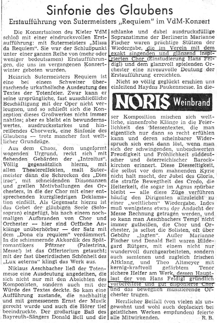 Im 9. und letzten Sinfoniekonzert brachte Niklaus Aeschbacher neben der Paukenmesse von Haydn als norddeutsche Erstaufführung die „Missa da Requiem“ von seinem Freunde Heinrich Sutermeister. Das Haydn-Werk bekam in den bewegten Teilen Akzente einer nicht ganz gerechtfertigten Dramatik, die ihm etwas wunderlich zu Gesichte stand. Auch war der Kontakt zu dem Chore nicht immer ganz gesichert. Aber Sutermeisters, in großen Kontrastflächen gebautes „Requiem“ erhielt eine hervorragende, bis zur letzten Note erfüllte Wiedergabe. Endlich einmal ging Aeschbacher ganz aus sich heraus, musizierte voll, zügig und aus einem Guß, ohne Schablone und dünne Stellen. Er war selbst gepackt und riß auch alle Hörer in den Bann eines modern-kirchlichen Werkes, das zum mindesten in seiner glänzenden Faktur, in den reichen Orchesterfarben, aber auch in der starken seelischen Erfüllung große Beachtung verdient. Es ist nicht ganz leicht, Sutermeister gerecht zu werden. Stets empfindet man, daß er bewußt und als Könner alle Mittel, auch jeden Effekt zur Steigerung miteinbaut. Andererseits läßt sein hochempfindlicher Kunstverstand ihn Höhepunkte entwickeln, die fast erschrecken, da Verstand und stärkste Leidenschaft sie hochpeitschen und diese Mischung aus heiß und kalt eine Art von kühler Ekstatik ergibt.