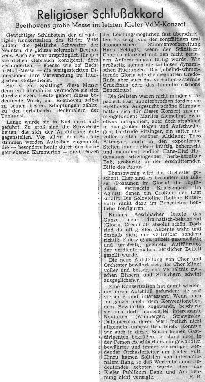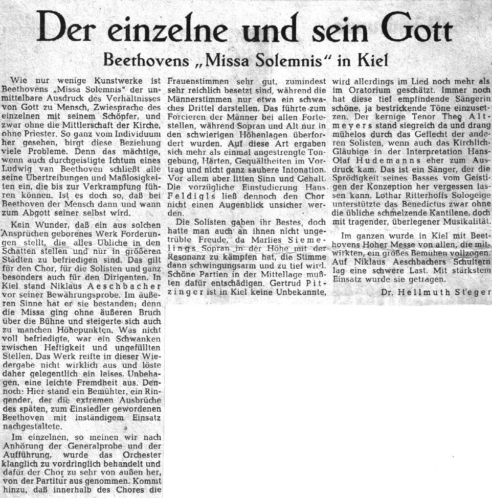 Die Solisten hatten großes Format. Nur Marlies Siemeling breitete ihren hochdramatischen Sopran (der in der Höhe durch allzu starkes Tremolo, in der Mittellage durch ein Von-unten-Ansingen der Töne an Ausdruckskraft verlor) etwas zu Brünhildenhaft aus. Gertrude Pitzinger bewies ihr gestalterisches Format vor allem durch noble Zurückhaltung; Dem ersten Rezitativ des Agnus dei aber gab sie bestechende dramatische Kraft. Theo Altmeyer verfügt über einen herrlich kultivierten, kraftvollen Tenor, der im „et homo factus est“ (und Mensch geworden) neben hinreißender Ausdruckskraft seinen ganzen Glanz offenbart, und Hans-Olaf Hudemann zeigte wieder die leuchtend ausdrucksvolle Fülle seines Basses.