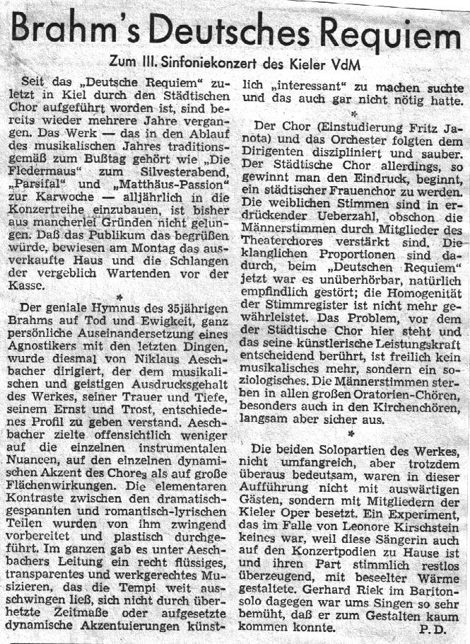 Die musikalische Leitung der Aufführung hatte Musikdirektor Niklaus Aeschbacher, der das Werk nicht ohne Pose dirigierte. Man kann kaum behaupten, daß er ihm in allen Teilen gerecht geworden wäre. Einerseits neigte er oft zu ermüdend schleppenden Zeitmaßen („Seid nun geduldig“, „Denn wir haben hier keine bleibende Statt“ und andere Stellen), andererseits hetzte er Fugen mit einem erbarmungslosen, niemals modifizierten Tempo herunter („Der gerechten Seelen“), wobei es zu polyphonem Leerlauf kam, der gewiß nicht im Sinne von Brahms war. Immer wieder geschah es, daß die empfindungsreichsten Motive im Orchester hölzern und steif klangen, wie in der Einleitung des zweiten Satzes, und leider allzuoft entstand der Eindruck, hier werde ein Notentext wiedergegeben, nicht aber musiziert und ein Kunstwerk in seiner geistigen Gestalt erfaßt.