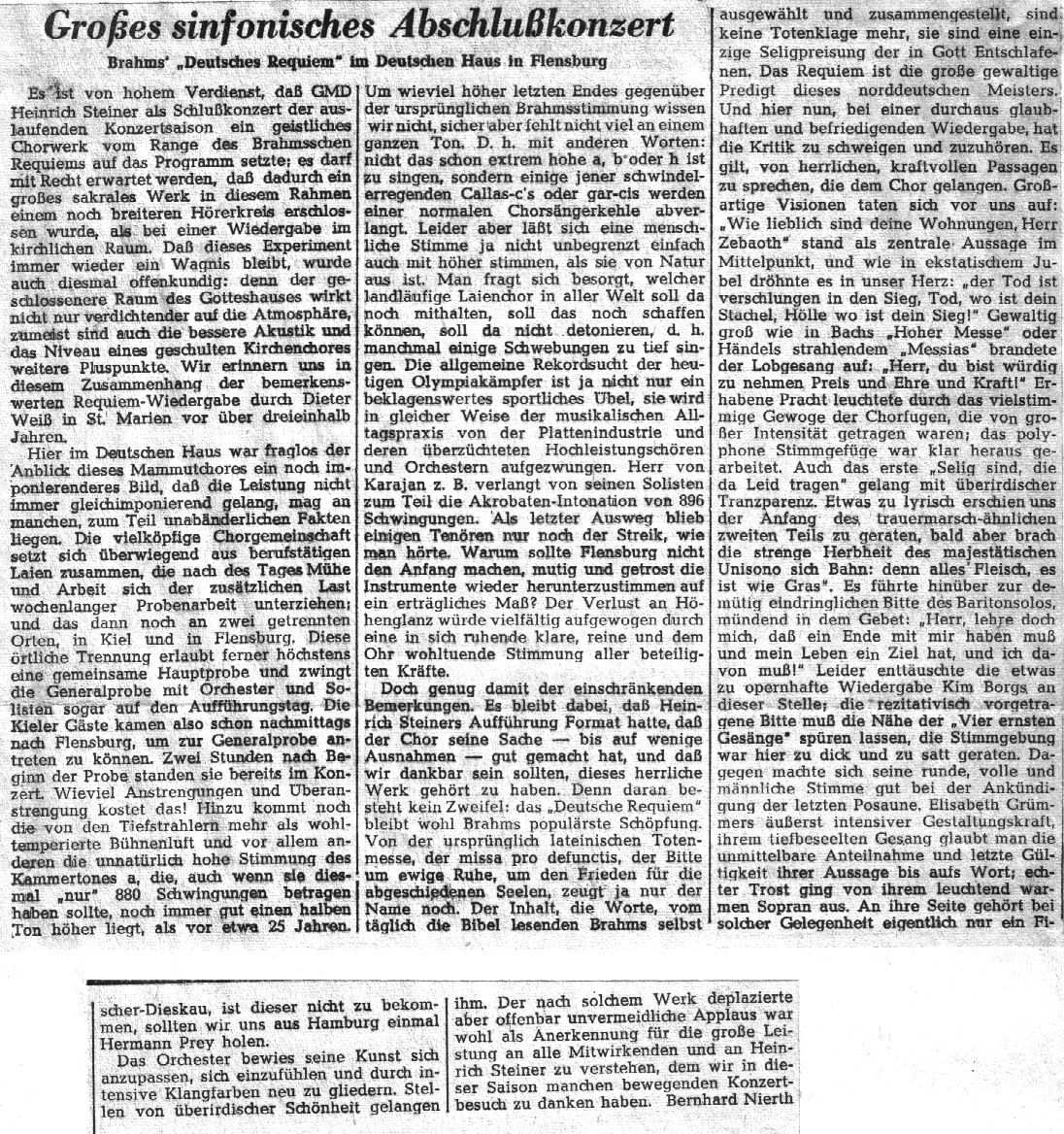 Mit einer Aufführung von Brahms' „Requiem“ schloß das Nordmark-Sinfonie-Orchester den Konzertwinter würdevoll und gewichtig ab. Es war unter der Leitung von Heinrich Steiner eine ausgewogene und von edlem musikalischem Ausdruck erfüllte Wiedergabe, die den unaussprechlichen Frieden, die verschattete, nur einmal machtvoll ausbrechende Trauer und den milden Trost, die das Werk durchziehen, in aller Eindringlichkeit hervortreten ließ. Einmal mehr bewährte sich die nun schon fast zur Tradition gewordene Zusammenarbeit zwischen den städtischen Chören von Flensburg und Kiel, die von Josef Beischer und Heinrich Blum (Flensburg) sowie von Christian Süss (Kiel) sorgfältig vorbereitet worden waren.