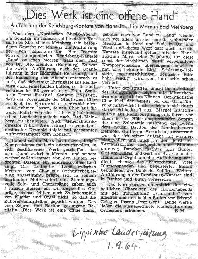 Ein ungewöhnlicher Erfolg war der Aufführung der Rendsburg-Kantate „Land zwischen den Meeren“ im lippischen Staatsbad Meinberg beschieden, wo nun schon seit fünf Jahren das Orchester der Landesbühne Schleswig-Holstein in Rendsburg unter Musikdirektor Hans-Joachim Marx als Kurorchester wirkt. Durch die guten Beziehungen zwischen Rendsburg und Kiel war es dem Komponisten H. J. Marx auch möglich, den Städtischen Chor Kiel, der bei der Uraufführung im Frühjahr dem Werk zum Erfolg verhalf, zu gewinnen, die Reise nach Meinberg anzutreten. Dem ausgezeichneten Chor mit seinem schönen Stimmenmaterial wurde stürmischer Beifall zuteil.