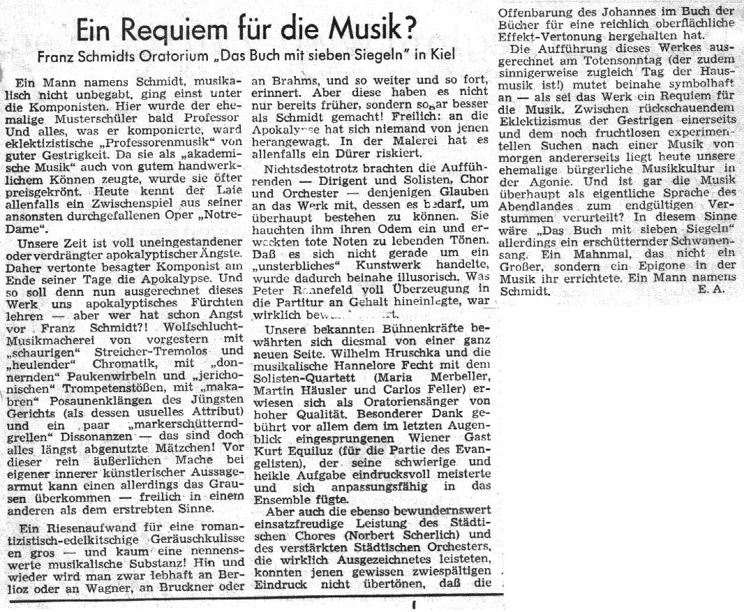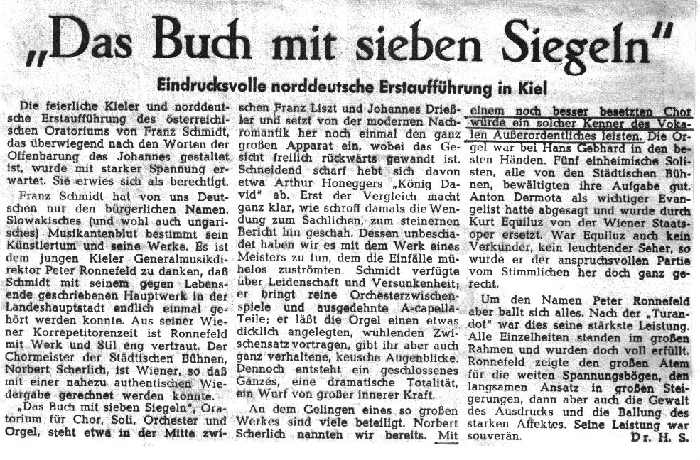 Ein ungewöhnlicher Abend — nicht nur von der Werkwahl, sondern auch von der Qualität der Aufführung her. Daß Franz Schmidts Oratorium, so dargeboten, dem Publikum kein Buch mit sieben Siegeln geblieben war, zeigte der Beifall — sehr herzlich, sehr lang, von Begeisterung für das Werk und seine Kieler Interpretation getragen.