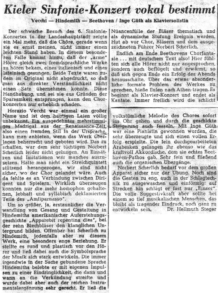 Im 6.Sinfoniekonzert, das der Verein der Musikfreunde im Kieler Stadttheater veranstaltete, stellte sich Norbert Scherlich als Konzertdirigent vor. Scherlich ist Chordirektor der Bühnen der Landeshauptstadt und Leiter des Städtischen Chores. So lag es nahe, ein Programm zu wählen, an dem der Chor entscheidenden Anteil hat. Mit Orazio Vecchis „L'Amfiparnaso“, Hindemiths „Aparebit repentina dies“ und Beethovens Fantasie für Klavier, Chor und Orchester op 80 war nicht nur dieses Anliegen erfüllt, sondern auch eine Vortragsfolge mit vielversprechenden, interessanten und seltener gehörten Werken zusammengestellt.