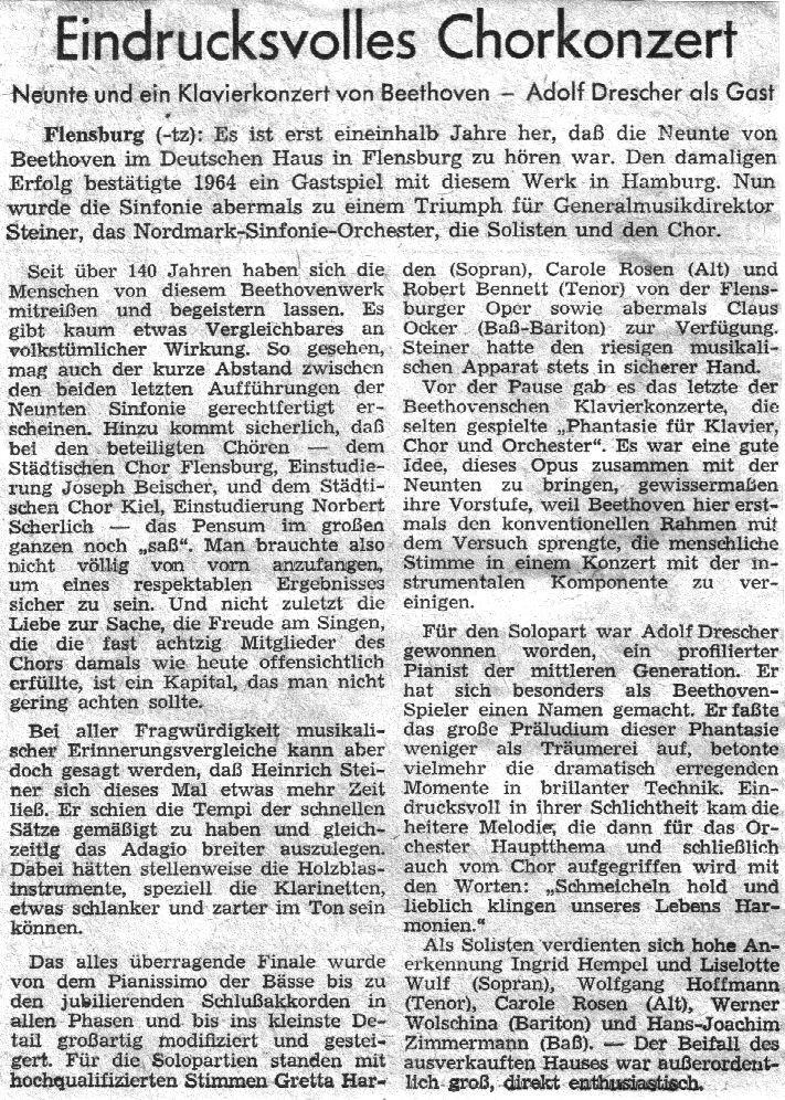 Die „Chorphantasie“ op. 80 voranzustellen, war gut.Steiner ließ wirklich „der Töne Zauber walten“, wie's im Text steht. Den poetischen Klavierpart spielte mit überzeugendem Beethoven-Sinn Adolf Drescher, der weithin die Illusion eines Klavierkonzertes schuf und immer mit schöner Deutlichkeit im Spiel blieb. (Nur einzelne Triller wollen noch präziser über die Holzbläser hinausklingen). In der solistischen Besetzung bewährten sich in künstlerischer Eintracht vom Flensburger Opernteam Ingrid Hempel, Lieselotte Wulf, Carole Rosen, Wolfgang Hoffmann, Werner Wolschina und Hans-Joachim Zimmermann. An der Chorphantasie konnte man sich begeistern: Sie schloß die Herzen auf für die Hauptsache des Abends. Dr. Wilhelm Hambach