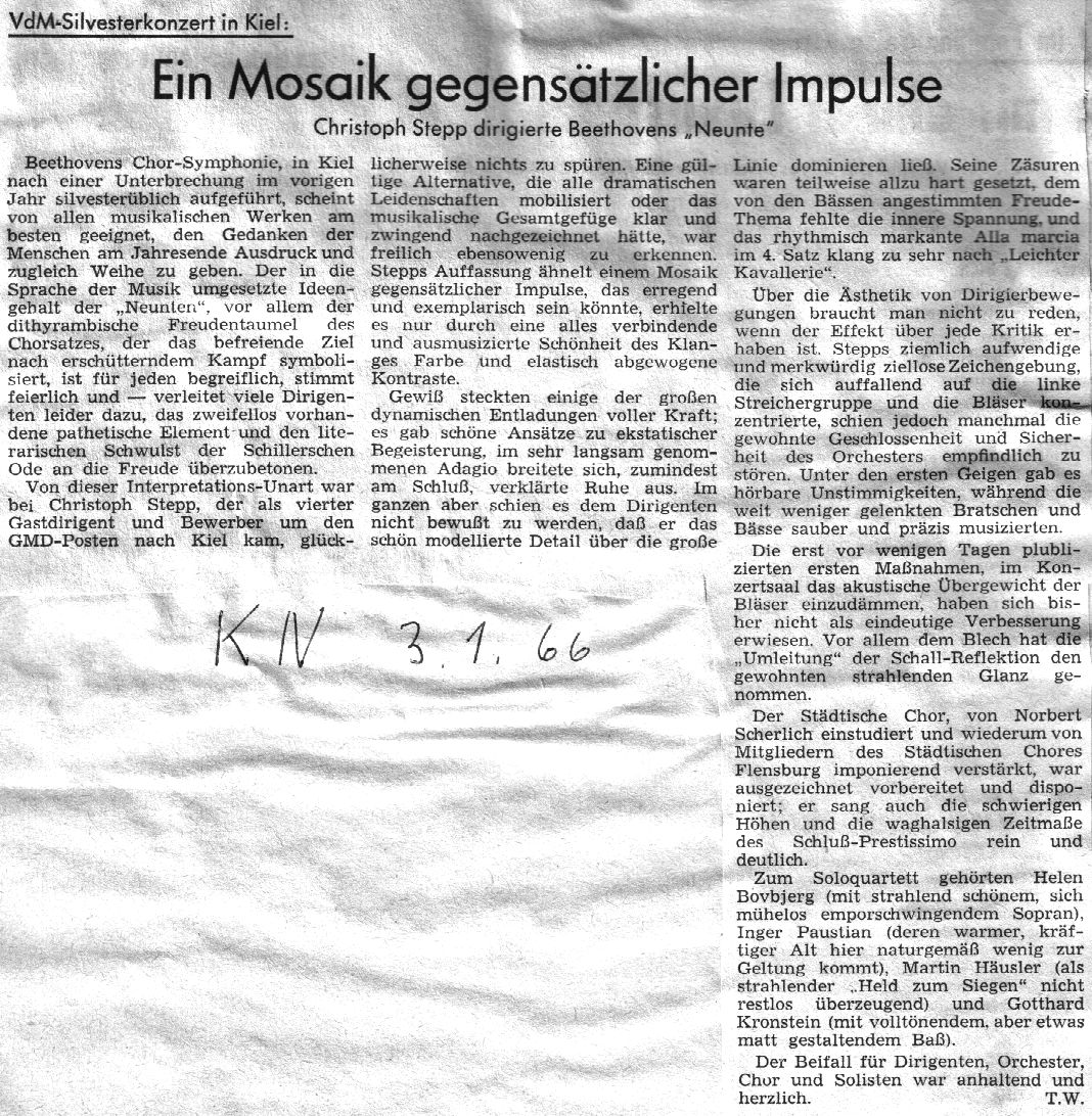 Keine Steigerung auch brachte der letzte Satz, brachte das Chorfinale. Die Aufführung schien Mendelssohn recht geben zu wollen, der diesen Satz für kaum realisierbar hielt. Nichts von dem dionysischen Freudentaumel, der bis zum strahlenden Jubel der Finalstretta immer mehr anwachsen muß, war zu spüren. Stepp versuchte, Intensität durch rhythmische Schärfe, forcierte Zeitmaße und dynamischen Volldampf zu erreichen — wobei es bisweilen erhebliche Ungenauigkeiten gab. Der Städtische Chor Kiel (von Norbert Scherlich einstudiert und durch Mitglieder des Städtischen Chors Flensburg verstärkt) bekam wenig Gelegenheit, seine Stimmkultur, seine Nuancierungsfähigkeit zu zeigen. Im Solistenquartett dominierten mit Entschiedenheit die beiden Damen Helen Bovbjerg (Sopran) und Inger Paustian (Alt), die ihre Partien sehr ausdrucksvoll und mit starker Leuchtkraft sangen. Der Tenor Martin Häusler stand zwar im Vokalquartett vollauf seinen Mann, war aber im Alla-marcia-Solo nicht voluminös und kraftvoll genug, durchaus kein „Held zum Siegen“, und der Bassist Gotthard Kronstein sang die wichtige Freudenbotschaft nicht mit der Würde, Kultur und Nachdrücklichkeit, die hier unabdingbar erforderlich ist.