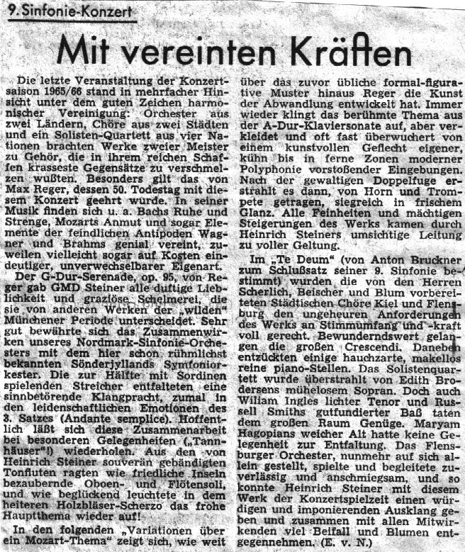Mit Anton Bruckners Te Deum in C-Dur für Chor, Soli und Orchester wurde die Konzertsaison 1965/66 der Flensburger Philharmoniker akustisch wie visuell imponierend beschlossen. Mag die Kritik am Aufbau dieses Alterswerkes eines großen, frommen und genialen Mannes manches beanstanden, u. a. die Reminiszenzen an Wagner: die Größe und innere Wahrhaftigkeit steht außer Zweifel. Ihr wurde auch die gediegene Wiedergabe gerecht, für die vor allem der von Norbert Scherlich einstudierte Städtische Chor Kiel und der von Josef Beischer und Heinrich Blum vorbereitete Städtische Chor Flensburg mit Lob bedacht seien. Denn beträchtliche Schwierigkeiten lauern in der Höhe wie in der Tiefe. Die Stimmen aber klangen notenfest und textverständig. Auch dieses Chorbündnis wissen wir wohl zu schätzen. Die vier Solisten kamen vom Flensburger Opernensemble. Edith Brodersen setzte mit Intensität ihren klaren Sopran und Maryam Hagopian ihre warmtönige Altstimme ein, William Ingle war mit seinem lyrischen Tenor so recht in seinem Element, und Russell Smith gab eine baßkräftige Basis. Zum Te Deum musizierte das Nordmark-Sinfonie-Orchester in aufmerksamer Einheit mit Chor und Solisten.