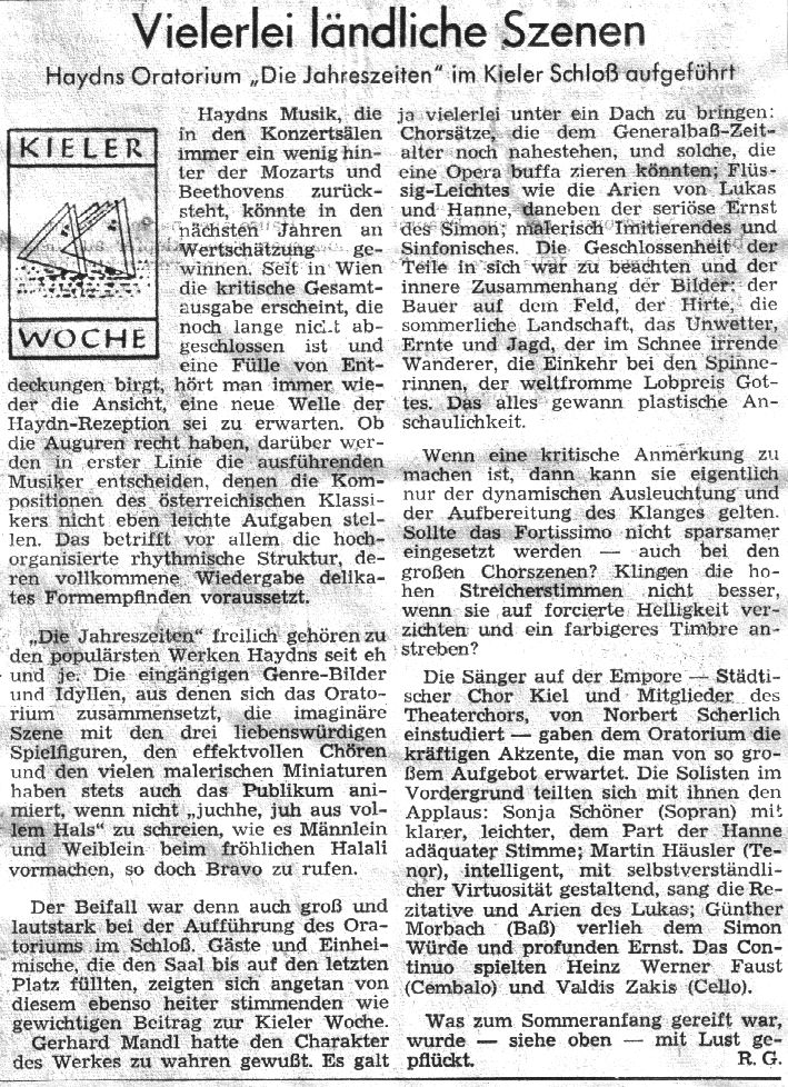 Die Aufführung unter GMD Gerhard Mandl zeichnete sich durch frischen Zugriff und schöne Differenzierung aus. Alles Malerische erschien ausdrucksvoll belebt, hatte Anmut und Poesie, kräftigen rhythmischen Akzent, ohne je derb oder überzeichnet zu wirken. Ein natürliches Espressivo, eine mit Stilgefühl abgewogene Dynamik, eine gewisse Ruhe und zugleich Elastizität der Tempi gaben Haydn sein ganzes Recht. — Die Chöre (Einstudierung: Norbert Scherlich) waren in sich sauber durchgeformt und sehr überzeugend in die Gesamtaufführung eingebunden. Der Städtische Chor Kiel, verstärkt durch Mitglieder des Theaterchores, scheint an Leuchtkraft zu gewinnen — und dies gilt keineswegs nur für die Frauenstimmen. Sehr beteiligt, elegant in den Soli, musizierte das Städtische Orchester. Daß man am Ende ein wenig ermüdet war — nun, fast drei Stunden der Freude an dieser schönen und immerzu so erfreulichen Welt sind für uns heute eben nicht mehr ganz mühelos nachzuvollziehen.