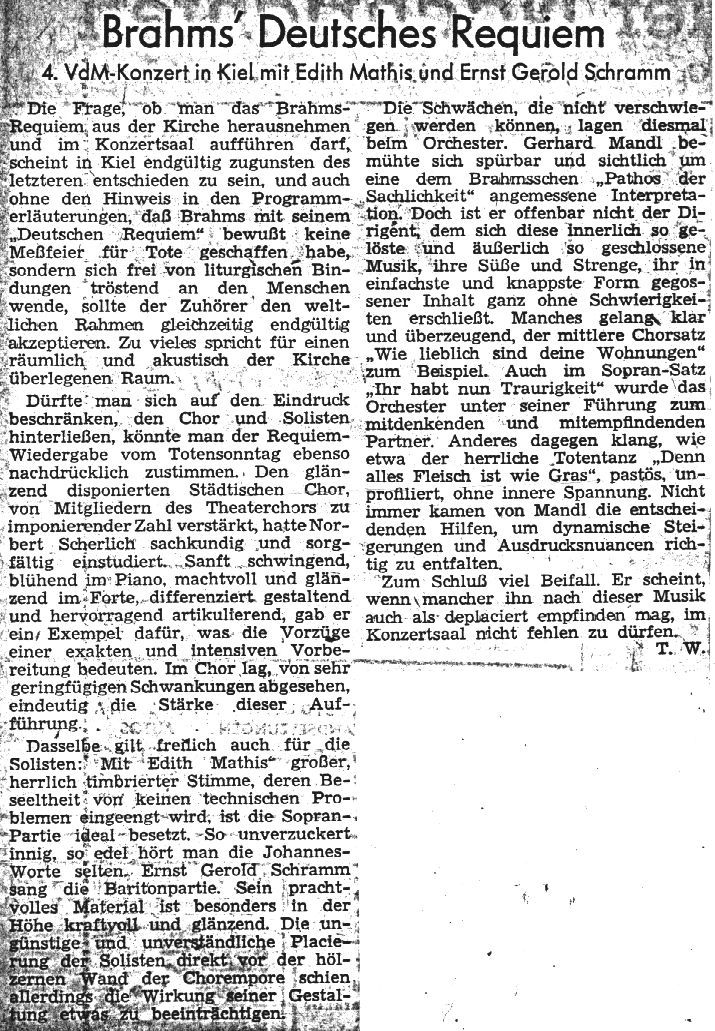 Edith Mathis (Hamburg/Berlin) sang das Sopransolo ungemein kultiviert; ihr Ton bleibt weich und rund, ihre Timbre warm auch in der hier so schwierigen Höhenlage, ihr Ausdruck ist innig belebt, ohne der Grenze zum Sentimentalen auch nur nahe zu kommen. Ihr Adäquat der Bariton Ernst Gerold Schramm (Hannover), dessen schön geführtes Material durch ungewöhnliche Leuchtkraft besticht.