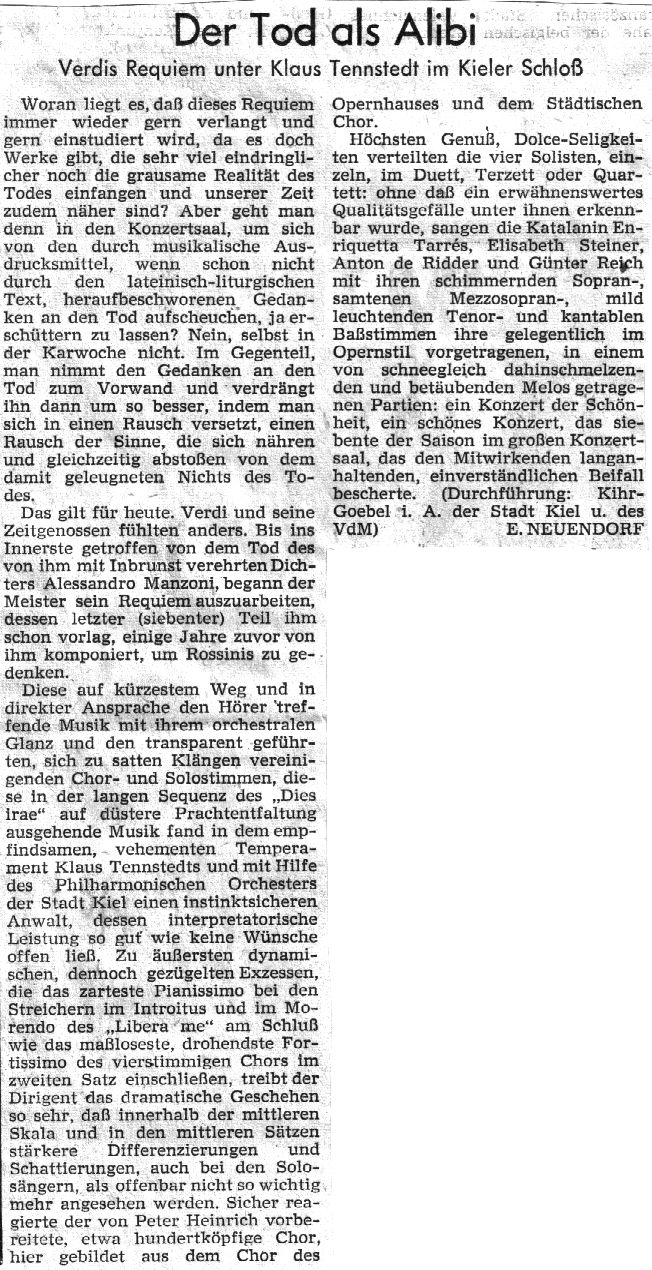 Eine überzeugende Aufführung von Verdis „Messa da Requiem“ unter Klaus Tennstedt war im 7. Kieler Philharmonischen Konzert zu hören: Das Solistenquartett war mit Enriquetta Tarrés, Elisabeth Steiner, Anton de Ridder und Günter Reich hervorragend besetzt. Am meisten wußte dabei die Tarrés zu fesseln. Jeder Einsatz, jede Phrase wurden bei ihr zum Hörerlebnis. Die Intensität ihrer Textgestaltung war bewundernswert, ebenso der Glanz ihres makellos geführten Soprans, der im Pianissimo wie auch im Fortissimo biegsame Geschmeidigkeit und durchdringende Tragfähigkeit besitzt.